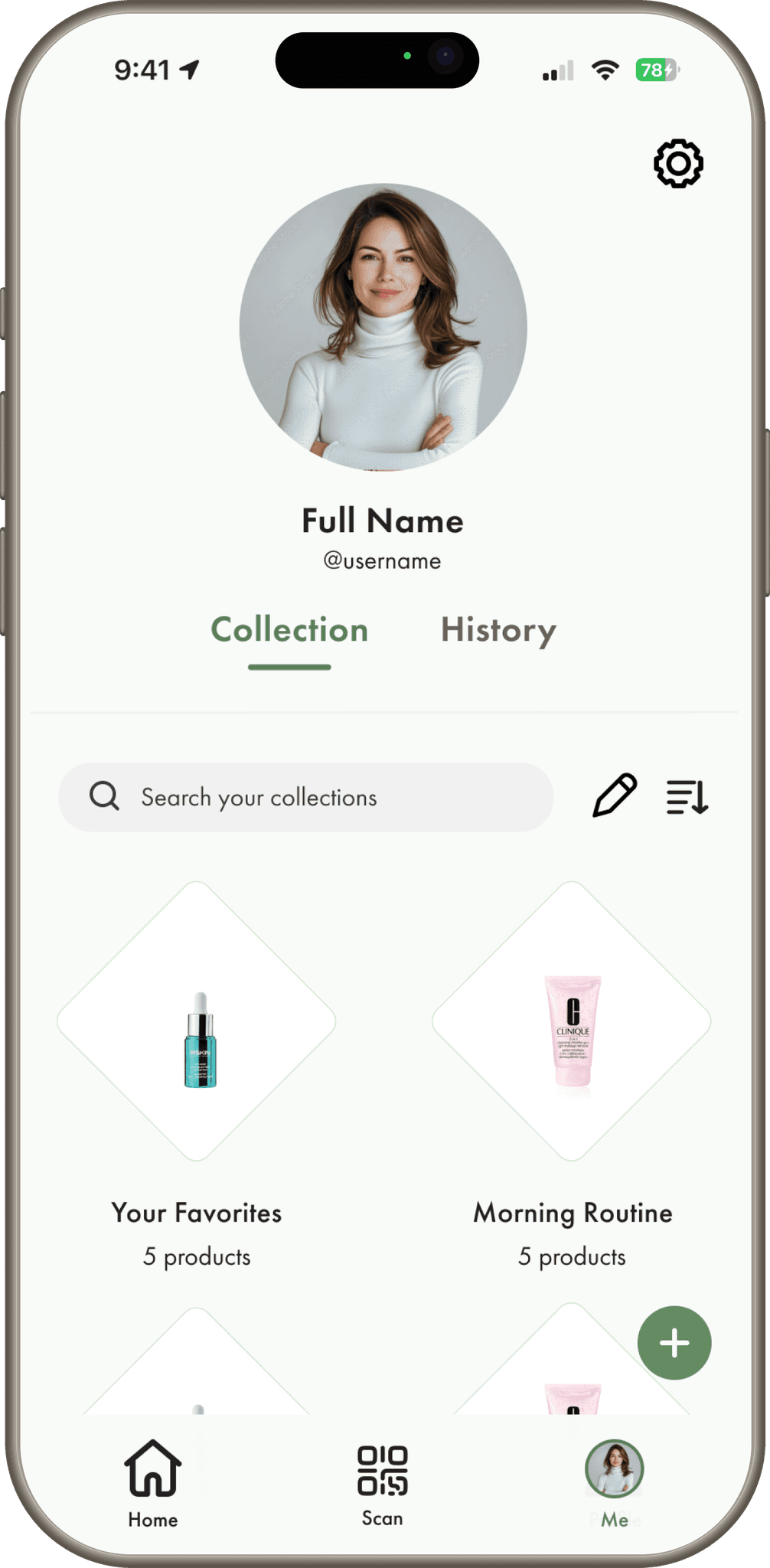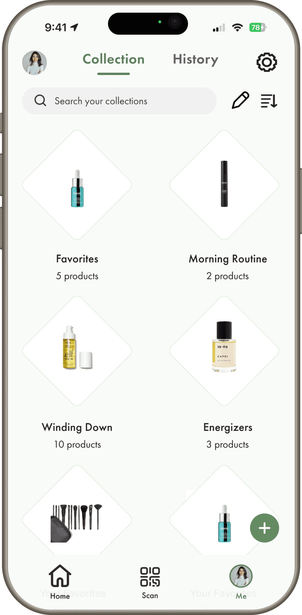Navigation bar with five core tabs: Home, Scanner, Collections, History, Profile