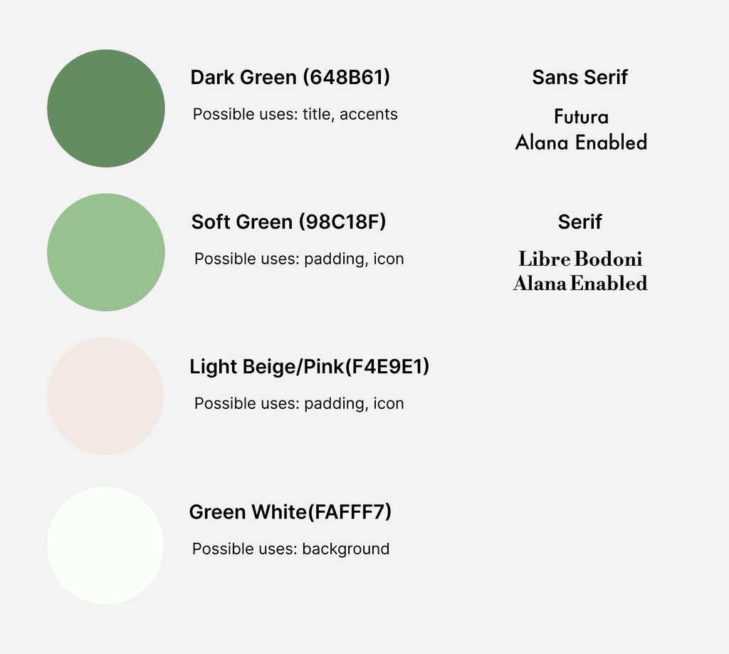 Through color psychology research (with references to our target market of women and wellness branding), I proposed a palette designed to build trust and approachability: