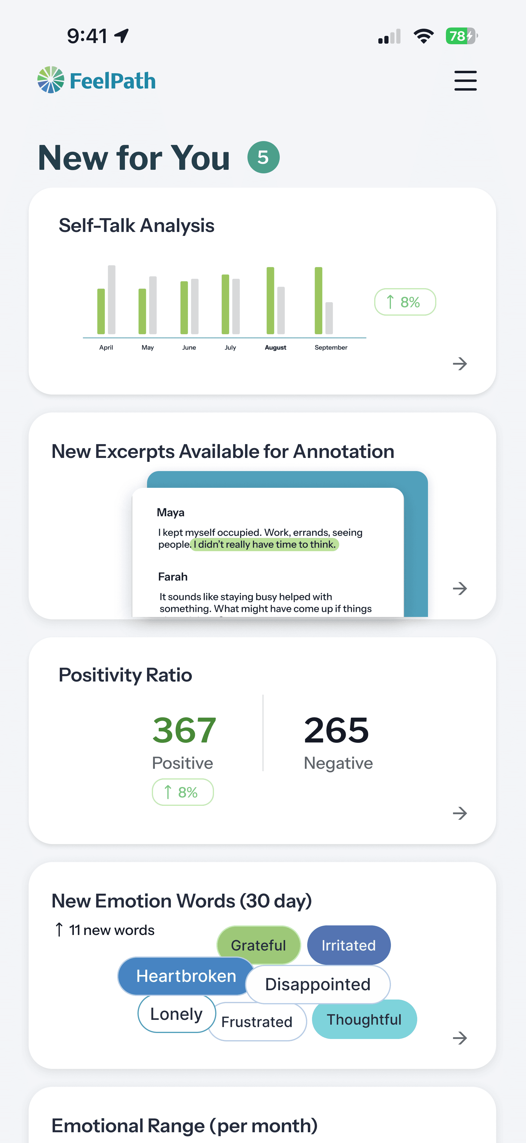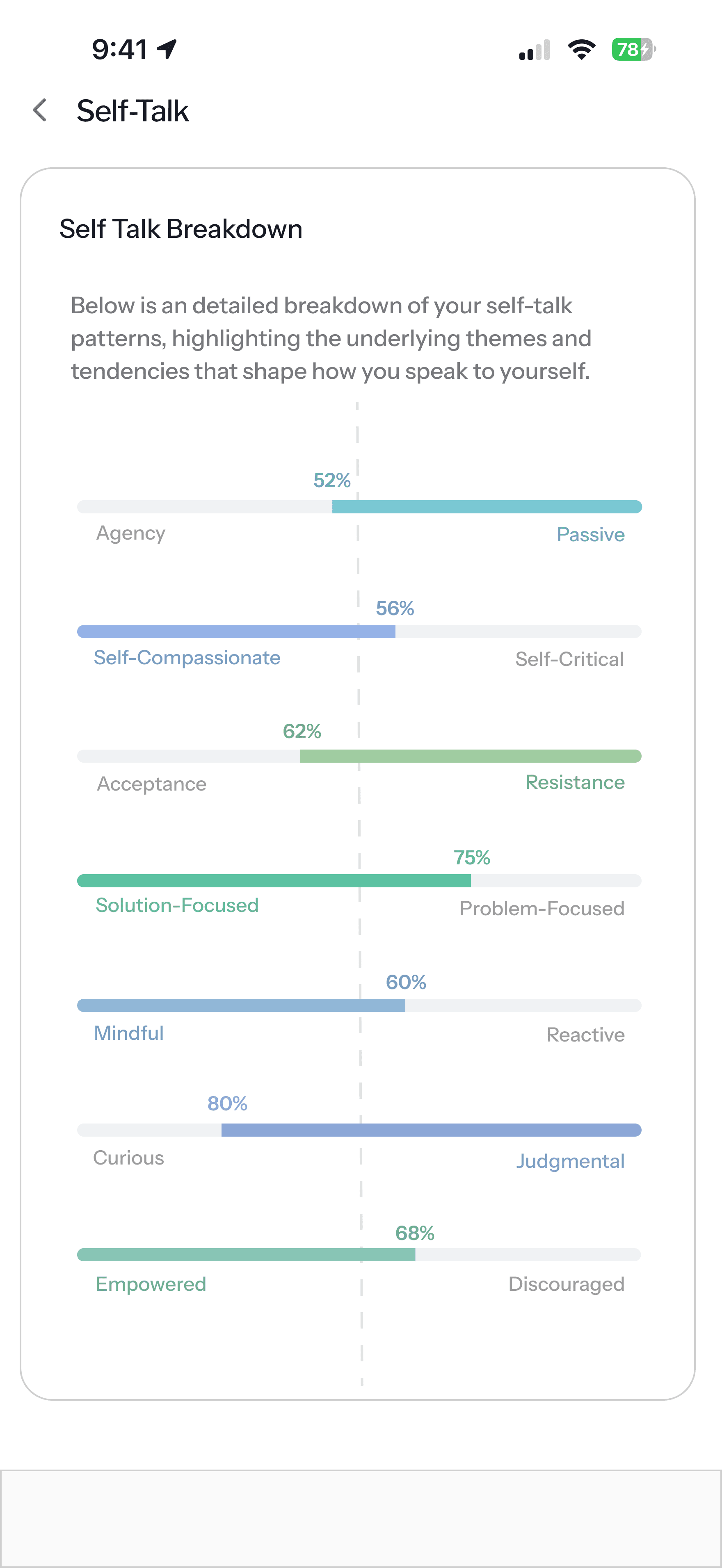The design here acknowledges that emotional growth is not linear. For example, the self-talk feature was redesigned from a line graph to comparative bar views to avoid implying 'upward' trajectory. In the more in-depth analysis, percentage bars allow 'opposing' states to coexist, without biasing for or against either side of the labeling spectrum.