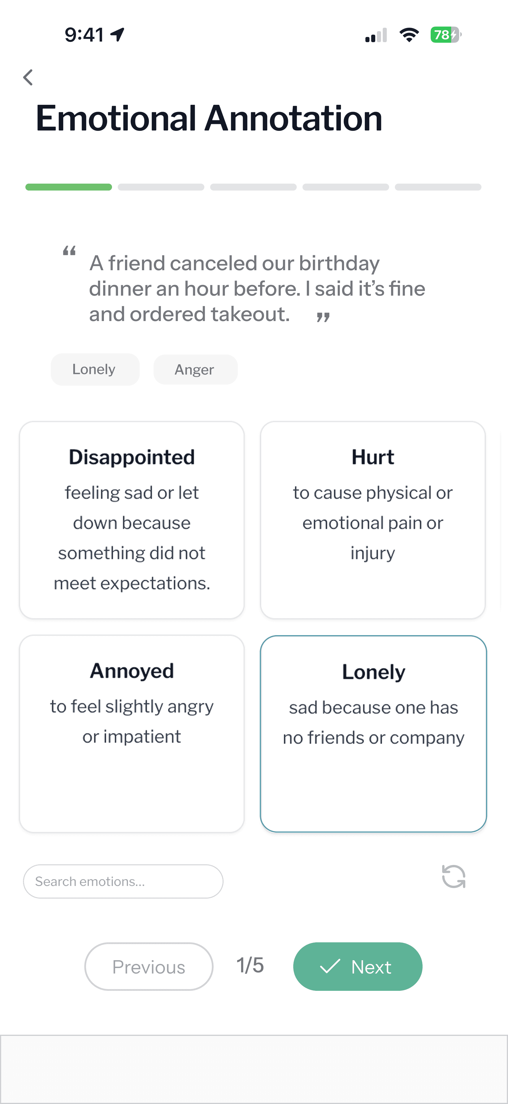These two moments are subtle nudges designed to help users move from noticing to processing emotions, while still fully respecting user autonomy.